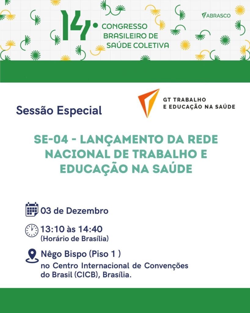 Iniciativa da Associação Brasileira de Saúde Coletiva (Abrasco) e da Secretaria de Gestão do Trabalho e da Educação na Saúde do Ministério da Saúde (SGTES/MS), a Rede Nacional de Trabalho e Educação na Saúde (Retes) será lançada oficialmente no 14º Congresso Brasileiro de Saúde Coletiva, o Abrascão. O lançamento acontece no dia 03 de dezembro, das 13h10 às 14h40, na sala Nêgo Bispo, no Centro Internacional de Convenções do Brasil, em Brasília (DF). A atividade é aberta ao público.